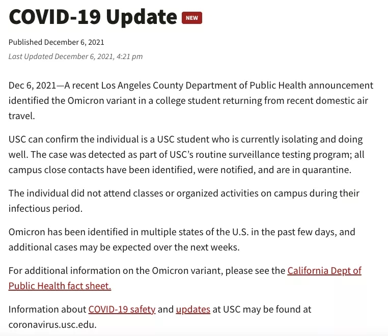 在南加大新冠病毒信息官网上,今天也发布了最新通知:“该病例是在学校常规的新冠检测项目中被检测出来的。那位学生正在进行隔离,所有校园密切接触者都已被确认及通知,目前正在接受隔离。在感染期间,该学生没有来校园上课或参加活动。”