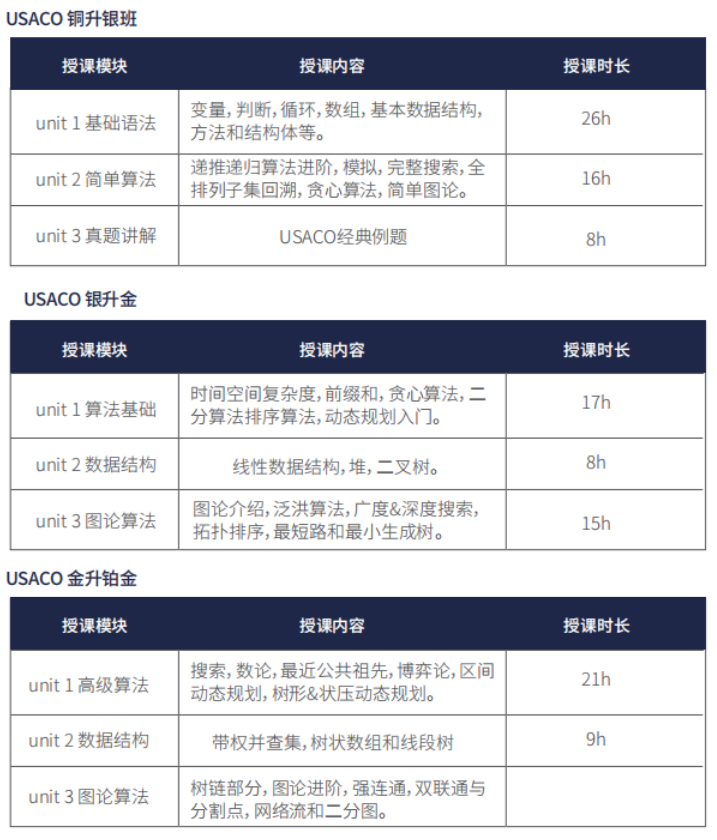 针对2024-2025赛季USACO计算机奥赛备考,我们开设有USACO计算机奥赛基础班,铜升银班,银升金班,金升铂金的班课,课程内容包含基础语法、简单算法、高级算法、数据结构、图论算法等内容,帮助学生升级打怪,冲击铂金!