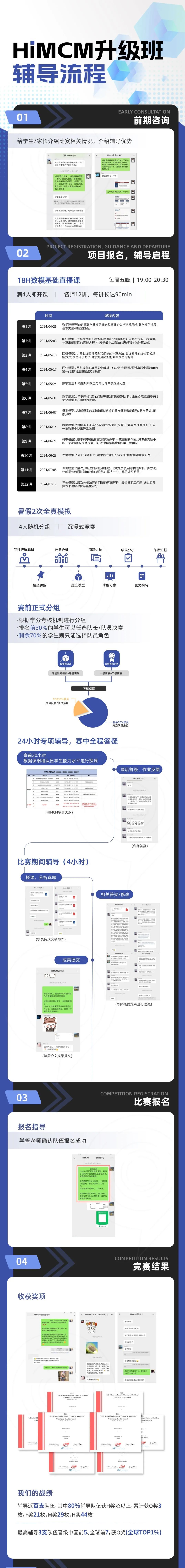 机构全新升级的HiMCM辅导培训模式,为不同基础的学生设置不同的班型,高效提升HiMCM备考效率,帮助学生针对性提升HiMCM成绩,在HiMCM竞赛中冲奖!