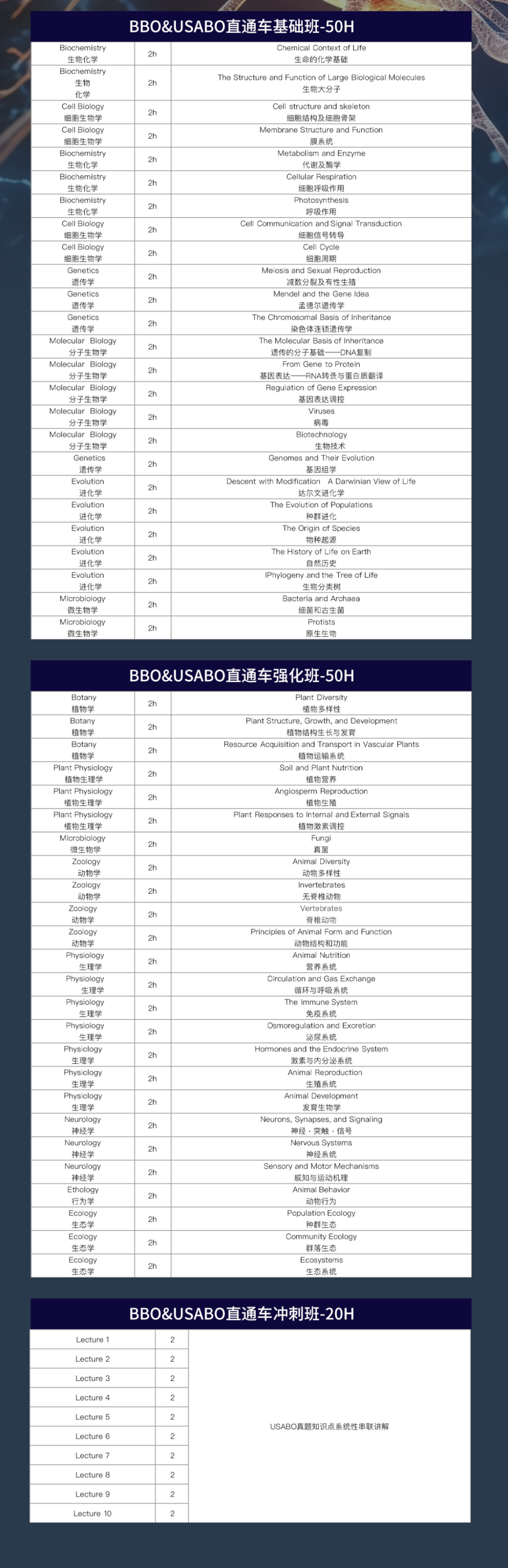 机构USABO&BBO课程有基础班(50h),强化班(50h),冲刺班(20h),总共120课时。
