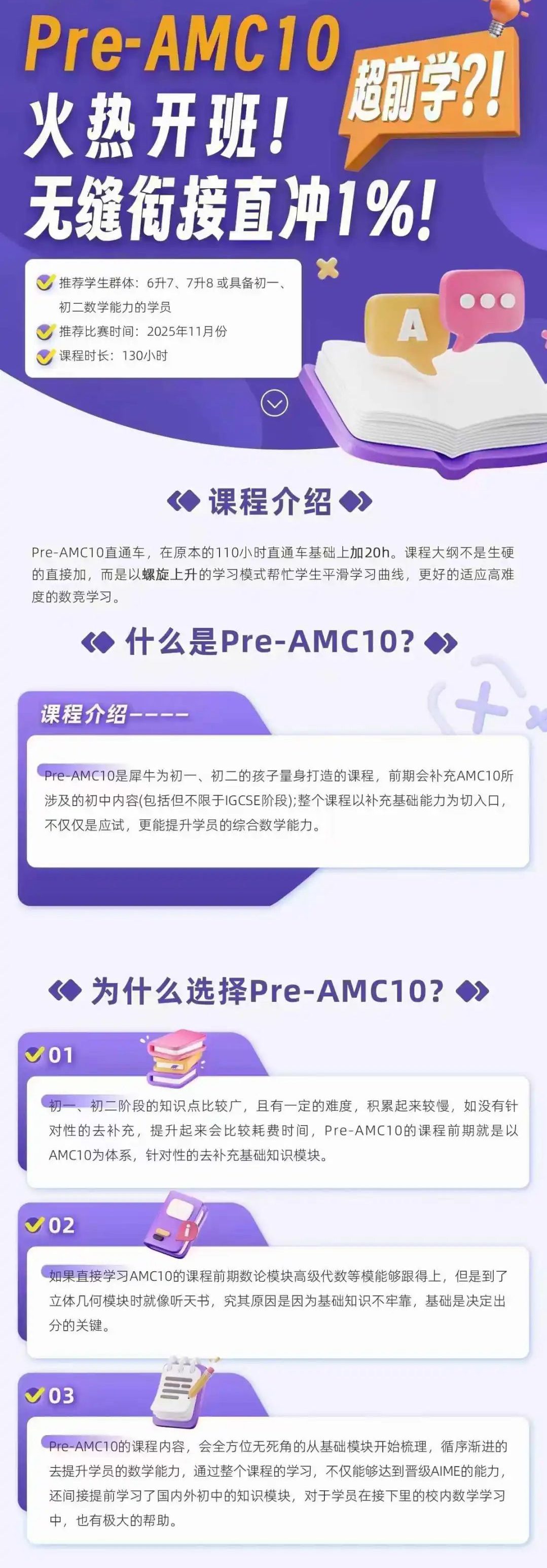 针对基础薄弱,打算备考明年AMC10/12的同学,我们设置了Pre-AMC10直通车、AMC10直通车以及AMC12直通车,大家可以先做课前测试,再匹配适合的班型。