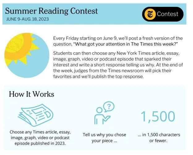 NYT Summer Reading Contest是纽约时报自 2010 年起,每年夏天都会举办的读写竞赛,至今已经是第13届,目前已经有来自全世界各地的 8 万多名中学生参与。目前该比赛即将开启报名,只要是11-19岁的初高中学生,均可免费参加。竞赛旨在激励中学生关心洞察身边的世界,思考自己未来和研究分析世界格局和社会现象,并通过写作竞赛来表达和传递自己的看法和想法。