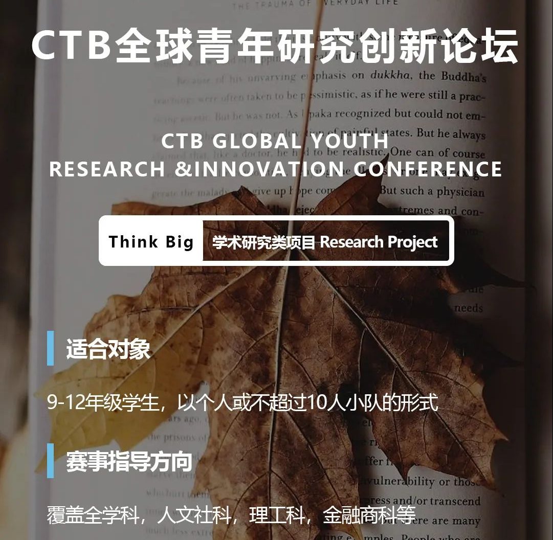 CTB源自哈佛大学研究课题展示项目Harvard Thinks Big ,旨在通过项目式学习、学术研究和调研实践,提升参赛者的自主探索和创新能力。CTB的命题多由哈佛学者、国内外顶尖大学教授及各领域专家学者主导,参赛者可以发起或者参与一个课题,通过实践调研、整合多学科学术知识并分析论述,完成一份学术论文。