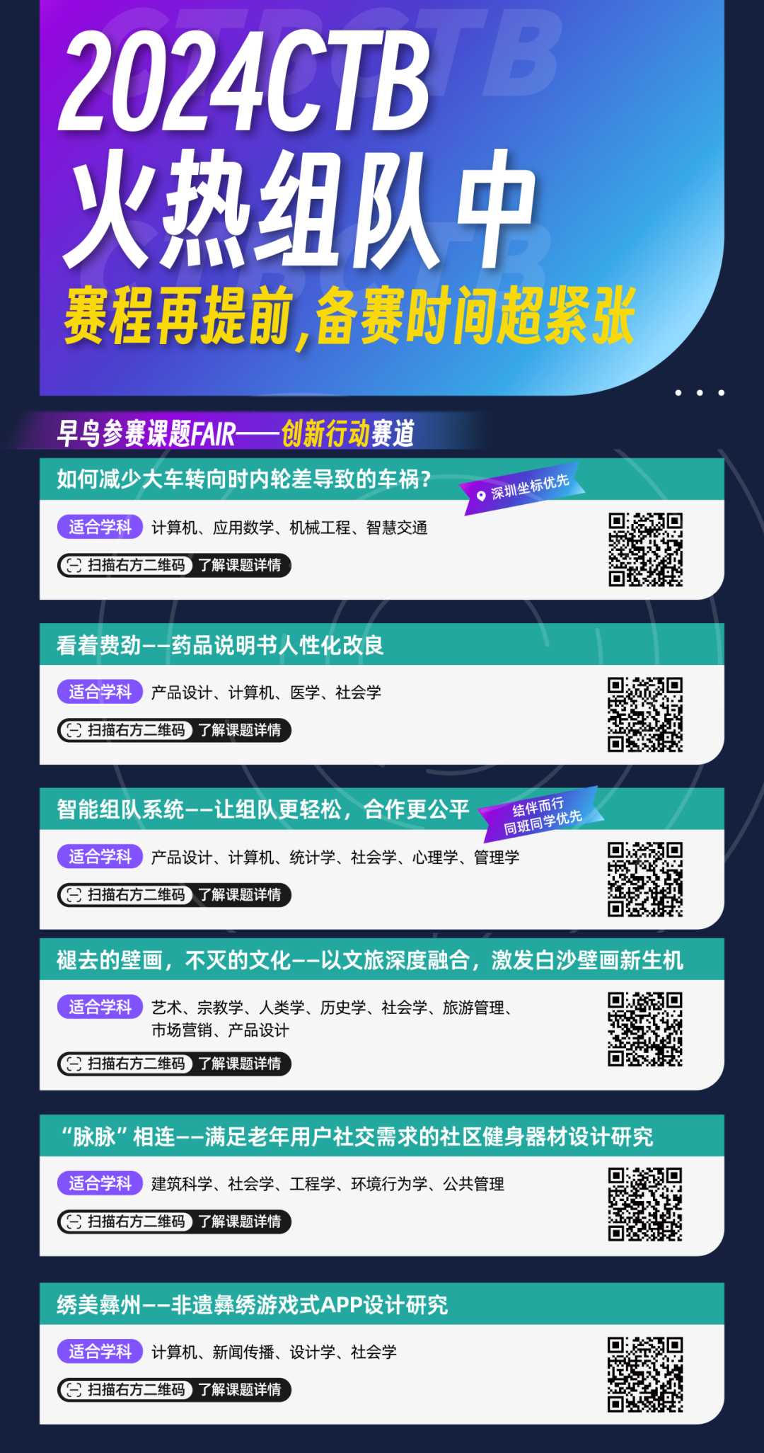 CTB竞赛鼓励中学生跳出传统思维模式,探索新的解决方案,需要有很高的创意性。课题的选择要考虑多方面的因素。