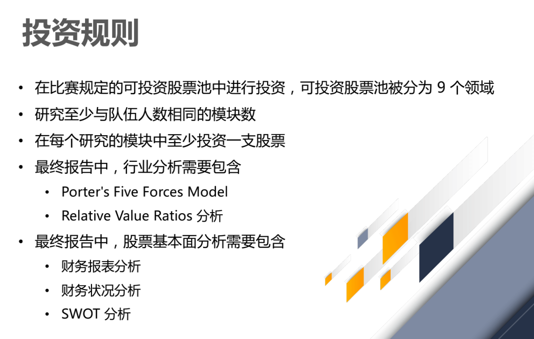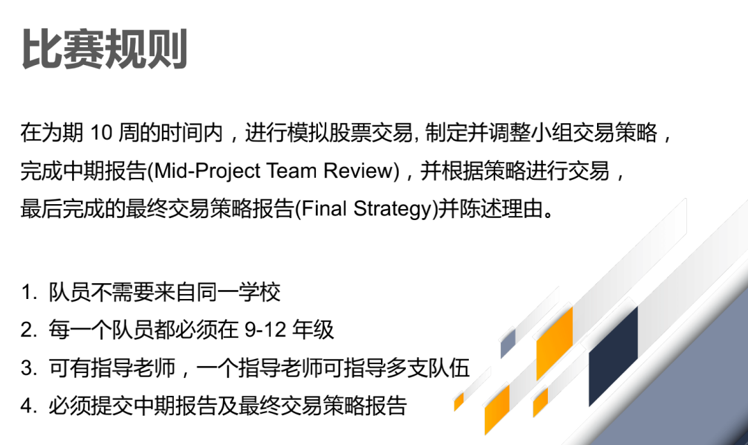 参赛期间是9-12年级的学生,对金融,经济学,数学,统计学等相关学科感兴趣,致力于申请英美知名商学院以及名校金融商管类专业的学生。