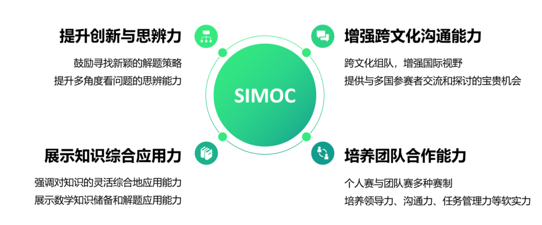 SIMOC涵盖了个人赛和团队赛,多元化的比赛方式不仅提升了数学思辨与创新的硬实力,更增强了团队协作能力和领导力的软实力,全方位地提升参赛者个人能力。