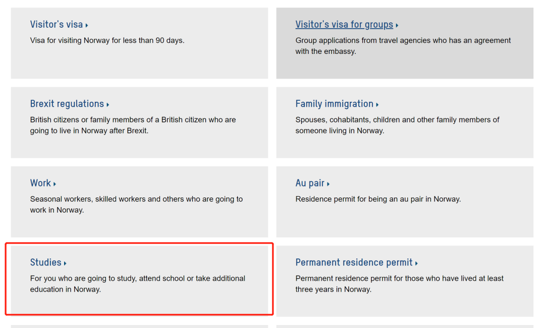 进入UDI官网,点击checklist,选择studies之下的checklist for students in higher education and high school students,国家就选China(港澳台就各自选各自的就行了),然后就可以看到签证所需的材料。