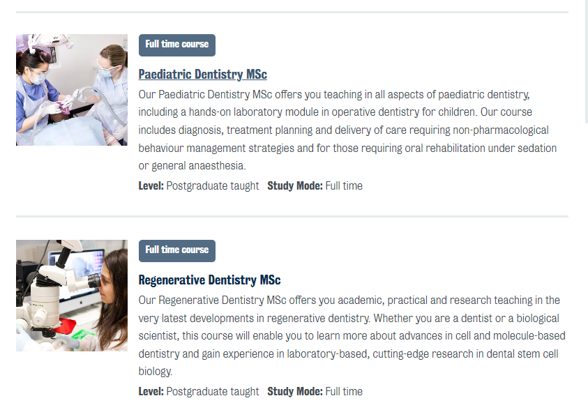 英国的牙医学本科学位一般为 5 年制,但如果你已经获得了生物学、化学或生物医学学科的至少二等一学位(2:1),可以申请 4 年制课程。