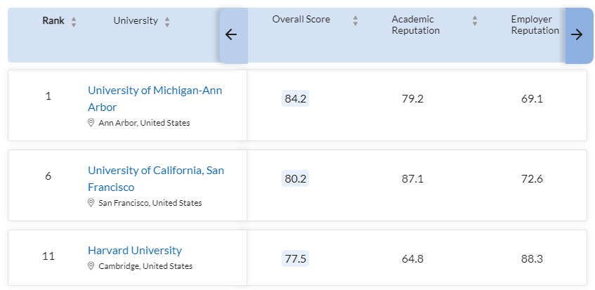 2023 QS 牙医学世界大学排名美国 TOP 10