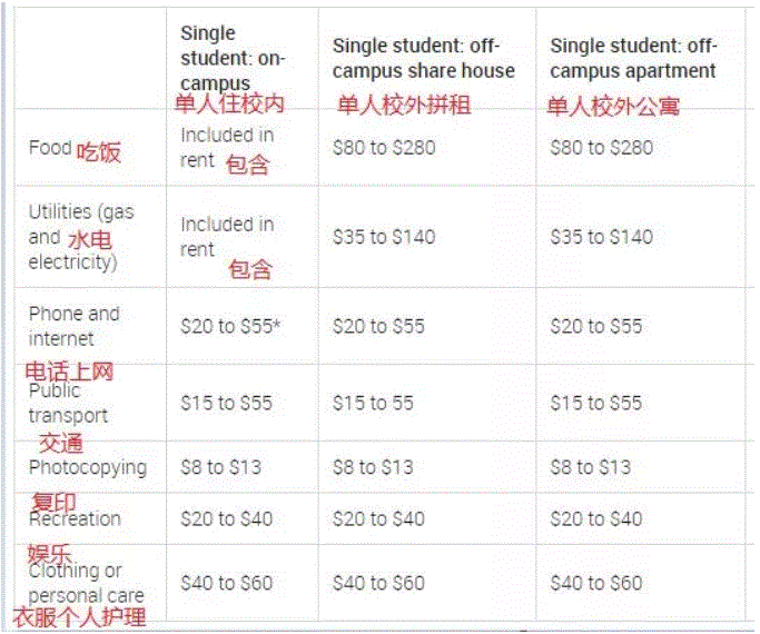 以上费用只是学生单人费用的大概数据,不包括学费,课本费用,其他与学习相关费用,也不包括买车,医疗费用,或者奢侈品费用;
