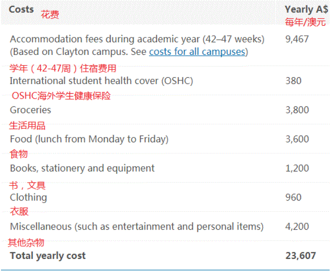 注意:以上费用只是大概数据,具体的要根据你的生活方式决定;37周是每学年的时间,不包括从12月到2月的暑假10个周;