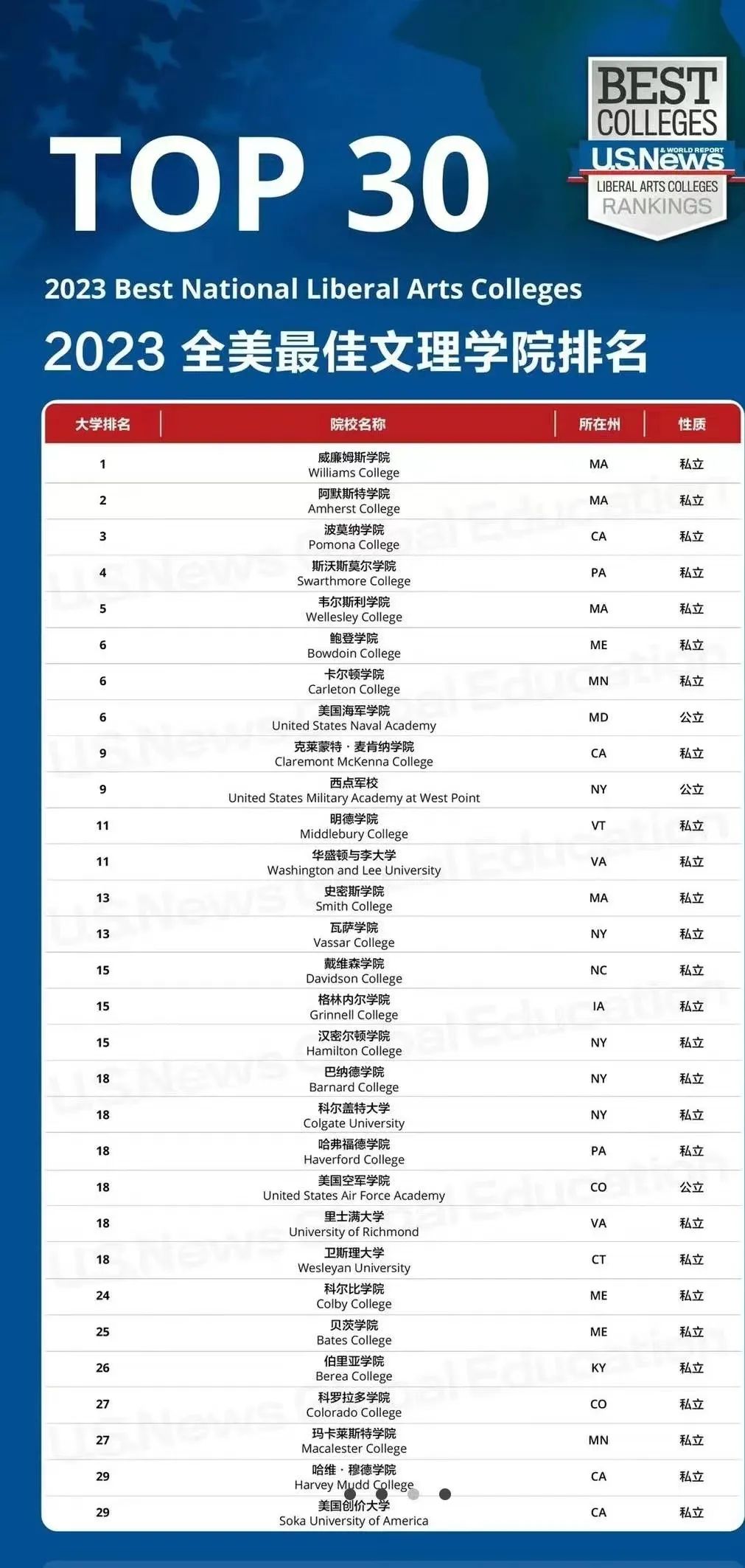 相较于美国综合大学,文理学院的热度稍低,所以我们仅关注2023全美最佳文理学院TOp30,每年文理学院变动不太大,因为他们每年的招生规模、师生比、学术声誉等因素变化就不大。