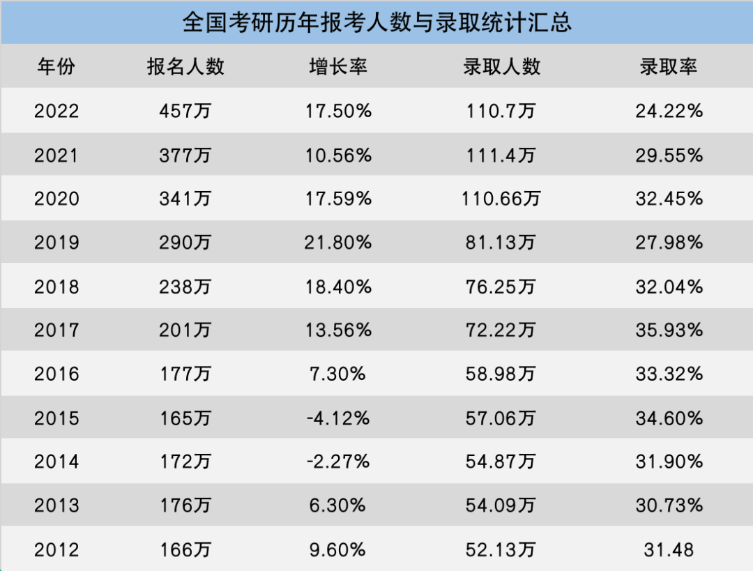2022年,在报考人数猛增80万的情况下,录取人数不增反降,录取率仅24.44%!从报录比数据来看,考研确实是一年更比一年难了。