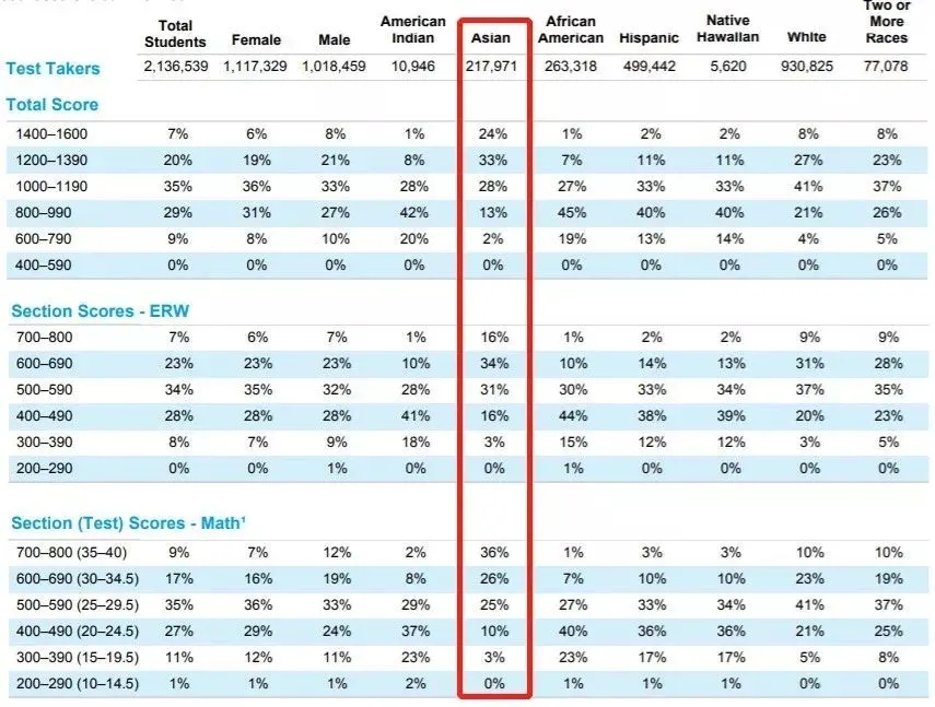 此前,College Board发布了SAT考试报告,可以看到:亚裔考生的平均成绩为1223分,远远大于其他国家考生。但也说明了:亚裔学生在申请美国大学时的竞争激烈程度!