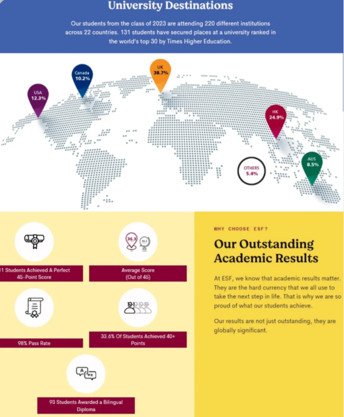 再来看学生的学术成果,在23年IB大考中,有11名学生获得45分满分,三成的学生达到40分以上。香港英基国际学校的均为36.3高于世界均分30.2,其中学生合格率达98%