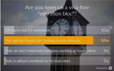 从目前来看,加、澳、新,英四国签证互通提议进展十分顺利。英联邦协会在四个联盟国举行了全民投票支持率显示,84%的被调查者支持这项"签证,移民互相承认"的计划。